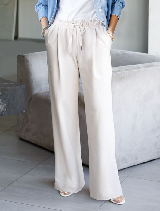Состав: 75%Хлопок 20%ПЭ 5%ПУ Плотность: 260 Г/м2 Параметры модели на первом фото: Рост 170, бюст 89, талия 63, бедра 92Брюки свободного кроя выполнены из эластичного футера-двухнитки. Модель дополнена защипами и боковыми карманами как у классических брюк и одним задним карманом. Эластичный пояс на резинке с шнурком из репсовой ленты и металлической фурнитурой. Брюки сочетаются в костюме с футболкой D49.031, D49.085, бомбером D49.038 и паркой D49.075