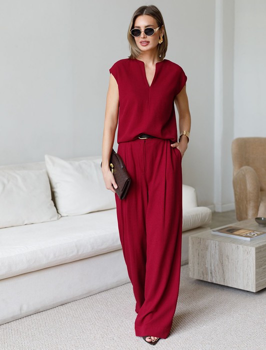 Состав: 70%Вис 30%Лен Плотность: 200 Г/м2Лаконичный топ гранатового цвета без застежек с V-вырезом выполнен изо льна с вискозой, плотносью 200 Г/м2. Сочетание льна и вискозы обеспечивает комфорт и прохладу в жаркие дни. Свободный топ c коротким цельнокроеным рукавом будет идеальным выбором для лета и весны, позволяя ощущать комфорт даже при высокой температуре воздуха. Особенность этого летнего топа — натуральный материал, который хорошо драпируется и мягко прилегает к фигуре, создавая струящиеся складки. Свободный крой топа обеспечивает комфорт, легкость и свободу движений, аккуратное полузакрытое декольте подчеркивает изысканность образа и женственность силуэта. Этот красивый топ подойдет для создания любого стильного повседневного образа, на работу или на важное мероприятие.