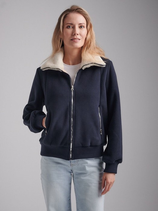 Толстовка женская из плотного флиса, дублированного мехом. Изделие с мягким меховым воротником, низ тостовки заужен трикотажным поясом. Карманы в боковых рельефах. Застегивается на молнию. Рукава втачные, с эластичными манжетами.