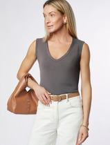 Атласная блузка-топ на регулируемых бретелях прямого силуэта, на широкой обтачке. Полочка с V-образным вырезом и нагрудной вытачкой, и печатью "Перо", и вышивкой бисером.