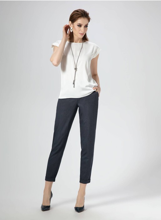 Лаконичная базовая блузка из тонкой струящейся ткани с небольшим блеском. Блузка полуприлегающего силуэта с круглым вырезом горловины. Горловина обработана тонкой планкой. Проймы блузки обработаны декоративными отложными манжетами. Такая универсальная базовая блузка станет неотъемлемым дополнением вашего гардероба.
