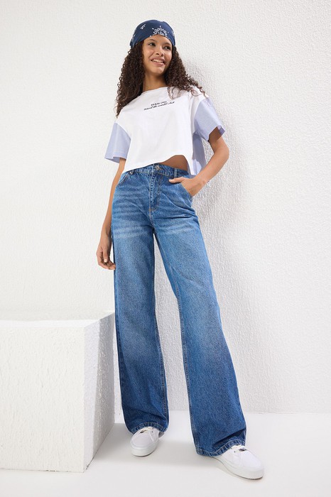 Совместные закупки Екатеринбург Женская одежда Джинсы — TRENDYOLMLLA Mavi Arka Bel Lastikli Normal Bel Wide Leg Jeans TWOSS25JE00228