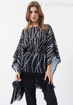 Нарядное пончо выполненное из шелковой ткани сделает Ваш образ незабываемым и ярким на любом мероприятии. Пончо прямого силуэта с декоративной бахромой по низу изделия. Возможно отличие фотографии по оттенку, связанное с различной цветопередачей монитора.