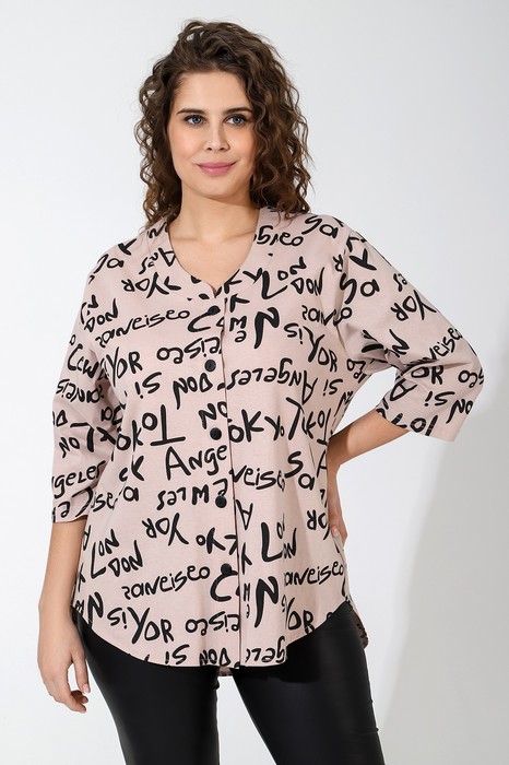 * Маркировка "Честный ЗНАК". Туника женская из трикотажного полотна «кулирка» с набивным рисунком, свободного покроя, с горловиной овальной формы, обработанной спереди притачными фигурными планками, втачными рукавами длиной 3/4, центральной бортовой застежкой на петли и пуговицы и фигурной линией низа.