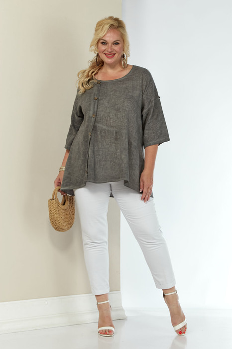 Женская льняная туника выполнена из высококачественного умягченного 100% натурального льна. Лён прошёл процедуру энзимного умягчения на производстве, поэтому туника не колется и не садится после стирки. Модель свободного силуэта к низу расширена, за счет подреза и легкой сборки по полочке. Вырез горловины округлой формы. По переду смещенная планка, декорированная пуговицами. Рукав трансформер, со спущенной линией плеча, регулируется при помощи паты и пуговицы. Спинка со средним швом. Низ изделия фигурный (спинка 76 см, перед - 59 см). Длина рукава от горловины 51 см.