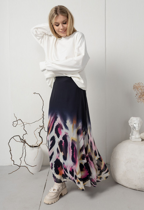 Шифоновая широкая длинная юбка с интересным многоцветным купонным принтом. Изделие на притачном поясе с застежкой на тесьму-молнию по спинке. Подкладка из  натурального вискозного трикотажика.