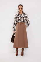 Задняя часть юбки с талиевыми вытачками и вертикальным средним швом в верхней части которого обработана потайная молния. Юбка на притачном поясе с эластичной тесьмой по задней части пояса и застежкой на петлю и пуговицу. По передней правой части пояса обработан декоративный элемент в виде свободно падающего хвоста. По передней левой части юбки обработана петля для хвоста.
