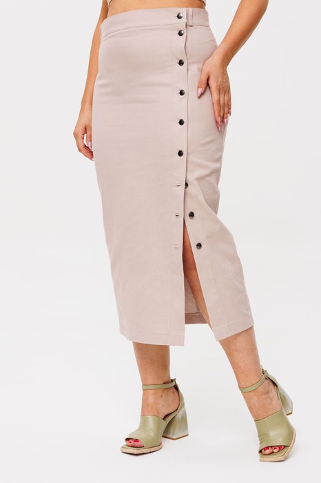 Кнопки спереди позволяют регулировать длину выреза, добавляя образу уникальность и удобство. Два кармана сзади не только придают юбке стильный вид, но и обеспечивают функциональность.