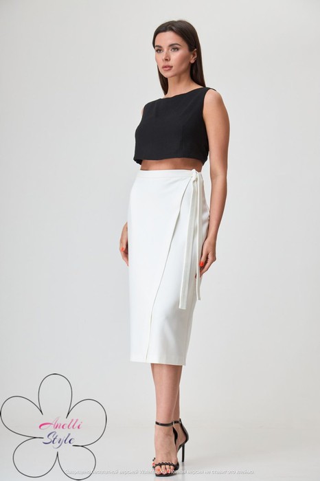 Юбка с элементом запаха, на притачном поясе. Выполнена из костюмной ткани в чёрном цвете, без подкладки. В новейших моделях запах располагается спереди сбоку. Это формирует изящный вырез треугольной формы, который смотрится очень женственно.