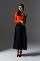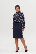 Юбка с элементом запаха, на притачном поясе. Выполнена из костюмной ткани в чёрном цвете, без подкладки. В новейших моделях запах располагается спереди сбоку. Это формирует изящный вырез треугольной формы, который смотрится очень женственно.