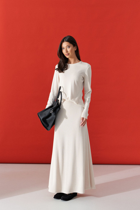 Юбка свободного кроя, выполнена из трикотажа молочного цвета. Характеристики: свободный крой, пояс на резинке, эластичная ткань, без подклада. Длина по боковому шву 97 см.