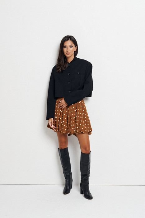 Стильная мини юбка выполнена из полотна шоколадного цвета с принтом горох. Характеристики: свободный крой, пояс на резинке, низ изделия – подгиб на резинке. Длина 46 см.