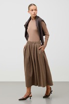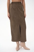 Юбка в длине миди, выполнена из эластичной синтетичекой кожи. Застёжка - гульфик с молнией, пуговица. По центру переда обработан разрез. По задним половинам настрочены накладные карманы. По переду обработаны втачные карманы.