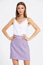Юбка прямого силуэта, из текстильной ткани, верхний срез юбки обработан обтачкой, заднее полотнище со средним швом, застегивается на потайную молнию. Шов переходит к низу в шлицу. По переднему и заднему полотнищах обработаны таливые вытачки. Длина по боковому шву 66 см. Юбка на подкладке.
