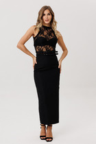 Юбка прямого силуэта из атласа и кружева. Юбка на обтачке. По переднему и заднему полотнищам юбки - вытачки. Юбка с застежкой в боковом шве на потайную тесьму-молнию. Верхняя часть юбки из атласа с асимметричный краем, нижняя часть юбки из кружева с ажурным низом. Юбка без подкладки.