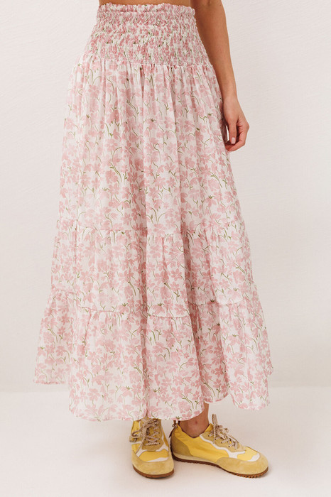 Юбка шифоновая А-силуэта на резинке с притачной кокеткой, которая отстрочена резинками. Юбка с 2-мя притачными слегка присборенными воланами. Юбка на подкладке.