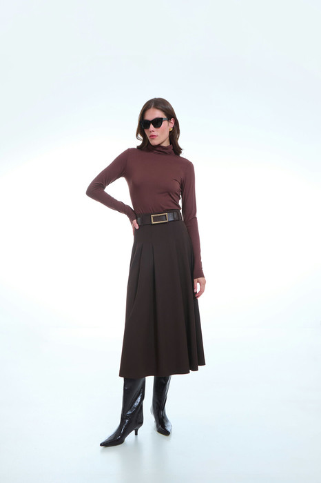Юбка женская, расширенная к низу, длина «миди». По переду 4 застроченные складки. В среднем шве заднего полотнища юбки застежка на потайную молнию. Пояс притачной, со шлевками. В комплекте готовый ремень.