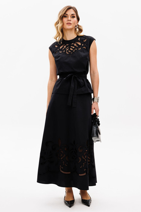 Юбка выполнена из плательно-блузочной ткани. Юбка А-образного силуэта, длиной миди. Юбка на притачном поясе. Спереди боковые карманы с наклонным входом. Сзади в среднем шве спинки застежка на потайную молнию. Юбка спереди по низу декорирована вышивкой.