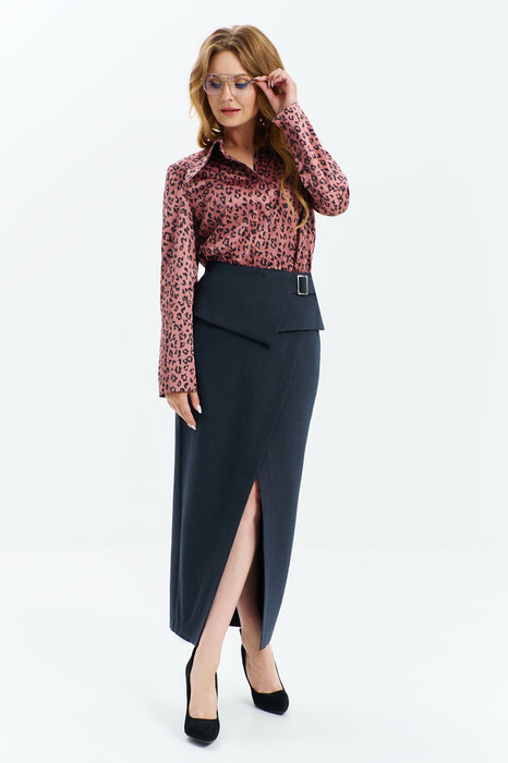 Юбка со съемной баской. Юбка длины макси (maxi), зауженная к низу . По переду юбки расположена запашная пола, и высокий разрез открывающий ногу ниже колена. Изделие на притачном поясе с резинкой в боковых швах. Застежка потайная молния в среднем шве спинки., баска съёмная, регулируется размер перетяжкой.