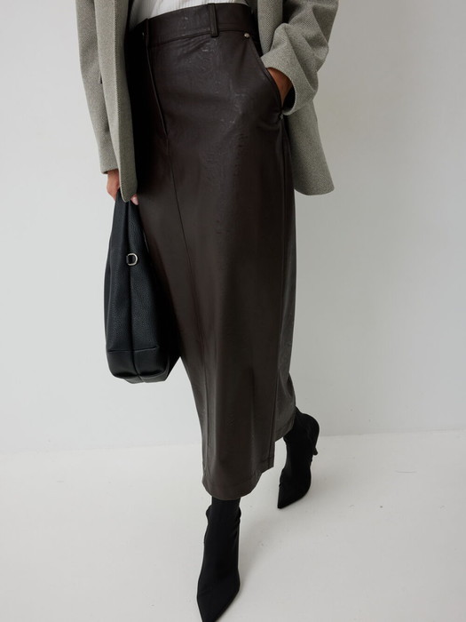 Юбка-карандаш женская из искусственной кожи. Длина юбки до середины икры. По переду в юбке обработаны карманы с отрезным бочком, по концам кармана установлены хольнитены. Перед юбки с центральным швом, в котором обработан гульфик с застежкой – молнией. Спинка юбки со средним швом в котором располагается разрез. Верх спинки юбки с отрезной фигурной кокеткой и вытачками. Верхний срез юбки обработан отрезным поясом, с резинкой по спинке и шлевками. Пояс застегивается на кнопку.