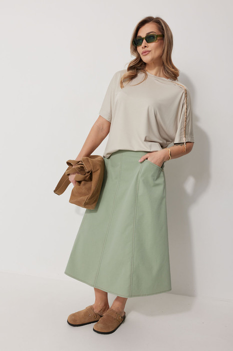 Юбка женская А – силуэта длиной до середины икры. Перед юбки состоит из 4 клиньев. Вверху передней части юбки располагается карман с отрезным бочком с хольнитенами по концам крмана. Спинка юбки состоит из 4 клиньев. Швы  всех клиньев отстрочены контрастной отделочной строчкой По среднему шву юбки находится застежка – молния.  Верхний срез юбки обработан обтачкой.