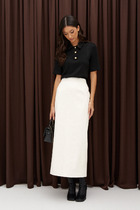 Ключевая деталь — разрез по переду, который добавляет образу динамики и практичности: он не только обеспечивает свободу движения, но и визуально вытягивает линию ног. Потайная застежка-молния сохраняет чистоту линий, подчеркивая лаконичность дизайна.