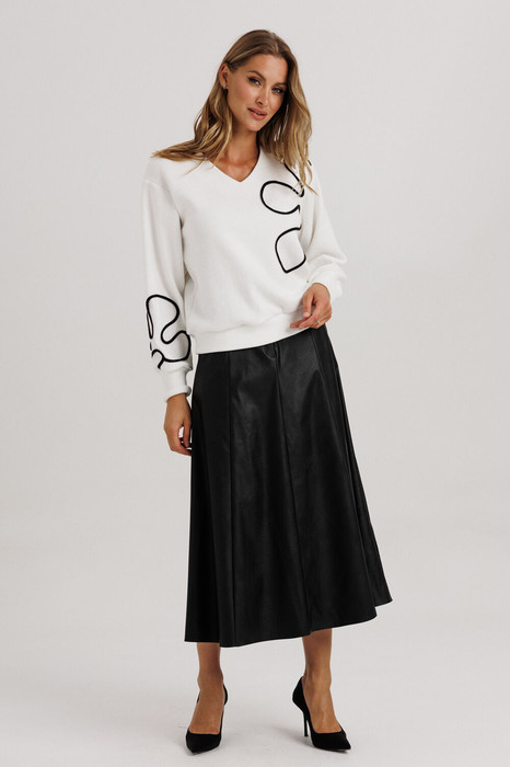 Юбка выполнена из эко-кожи, состоит из восьми клиньев с умеренным расширением по низу изделия. В боковых швах расположены наклонные функциональные карманы. В центральном шве полочки расположена застежка на молнию. Линия талии обработана притачным поясом со шлевочными держателями. В боковых сегментах пояса вставлена эластичная тесьма для дополнительного регулирования объема талии. Высота пояса 4,5 см. Застежка в поясе на две функциональные петли/пуговицы.