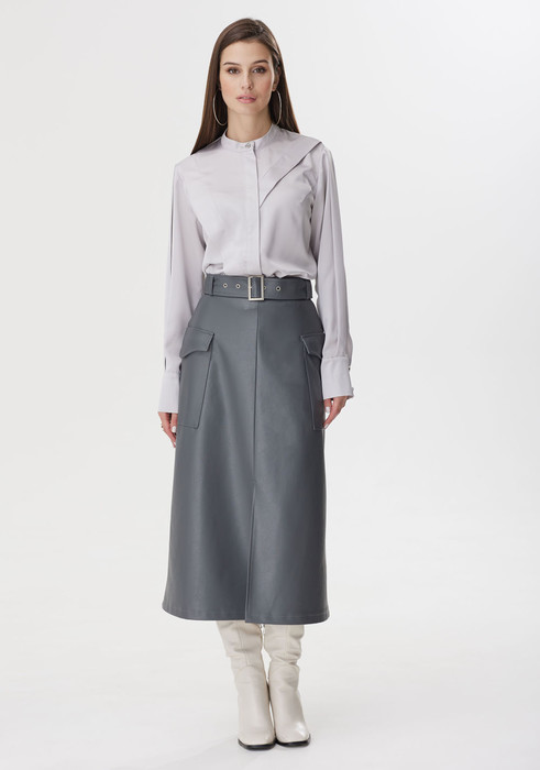 Юбка из эко-кожи на хлопковой основе, расклешенная книзу, на притачном поясе со шлевками для ремня, без подкладки. Переднее полотнище со средним швом, понизу с разрезом. Заднее полотнище с потайной застежкой на молнию в среднем шве. В области бедер обработаны накладные карманы с клапаном. В комплект входит съемный ремень из основной ткани.