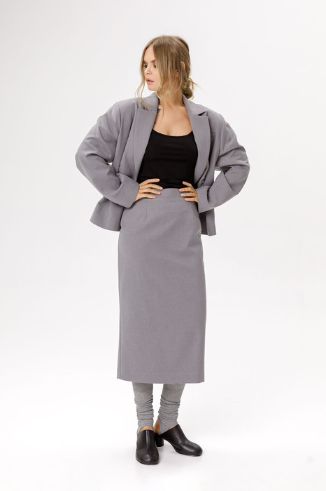 Детали: Юбка прямого силуэта, длина до середины икры, притачной пояс, талиевые вытачки на переднем и заднем полотнище, потайная молния в среднем шве спинки, юбка на подкладке.