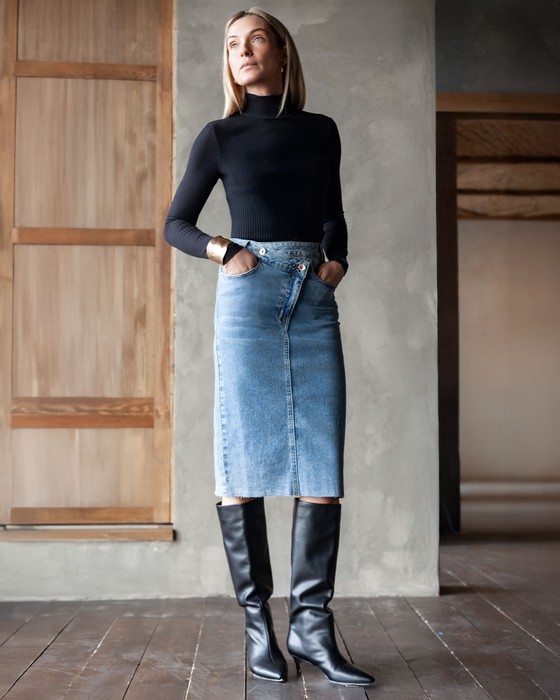 — Юбка с ассиметричной застежкой из эластичного денима