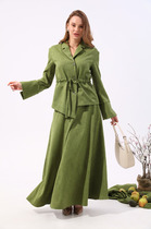 Юбка на подкладке прилегающего силуэта слегка заужена к низу, с завышенной талией. На заднем и переднем полотнище кокетка, состоящая из трех частей. Средний шов спинки с застежкой на потайную тесьму молнию и шлицей по низу. По швам стачивания кокеток задней и передней половинок юбки проложена отделочная строчка на 0,2 см по обеим сторонам шва. По линии притачивания кокетки также проложена отделочная строчка на 0,2 см. На кокетке передней половинке юбки пришиты 6 отделочных пуговиц.