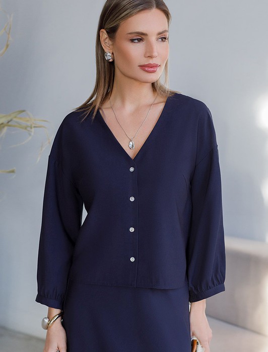 Состав: 92%Лиоцелл (Вис) 8%ПЭ Плотность: 180 Г/м2Элегантная укороченная блузка темно-синего цвета выполнена из плотного лиоцелла. Лиоцелл это более дорогой и экологичный вариант вискозы, очень прочный и шелковистый. Ткань отличается от регулярной коллекции из лиоцелла - она содержит еще больше лиоцелла (92%), благодаря чему имеет более нежную шелковистую фактуру. Модель дополнена объемными рукавами длиной 7/8, создающими модный акцент. Укороченная передняя часть блузки выгодно подчеркивает линию талии, а удлиненная спинка обеспечивает комфорт. Этот асимметричный фасон придает образу динамичности, а V вырез визуально вытягивает силуэт. Свободный крой романтиной блузки не сковывает движений и отлично садится по фигуре даже на большие размеры, скрывая возможные недостатки. Эта легкая блузка с застежкой на пуговицы идеальный выборо для комфорта и стиля в теплое время года, она идеально адаптируется под любой повод. Комплект из лиоцелла подчеркнет ваш вкус и статус. Это идеальный выбор для особенных моментов. Такой образ будет уместен на торжественных мероприятиях и приемах, выпускных вечерах, семейных праздниках и свадьбах.