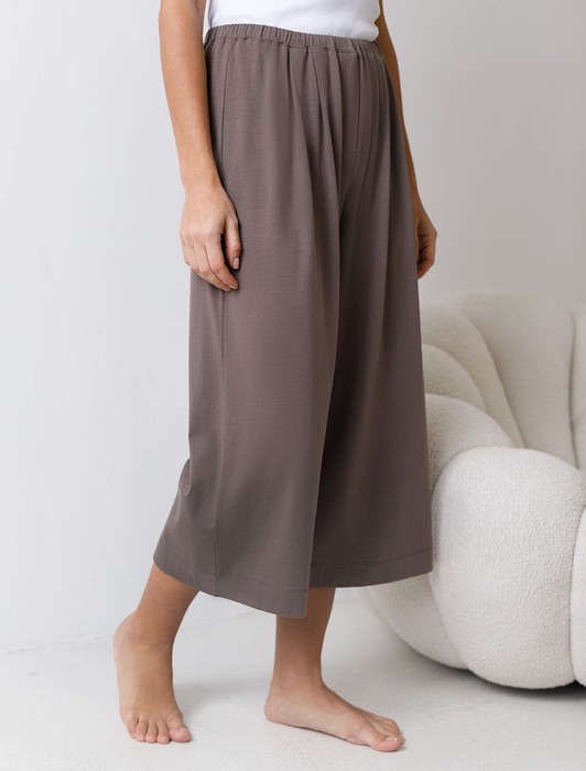 Состав: 100%Хлопок Плотность: 140 Г/м2Комфортные укороченные широкие брюки кофейного цвета на тонкой резинке выполнены из 100% хлопка плотностью 140 Г/м2. Главная особенность этого изделия — тонкое кулирное полотно, которое легче и воздушнее стандартного трикотажа. Благодаря своей деликатной текстуре модель идеально подходит для домашних образов и пижамных комплектов. Ткань отлично «дышит», обеспечивая максимальный уют во время сна и отдыха. Эти свободные брюки обеспечивают максимальную свободу движений благодаря широкому крою. Эластичная резинка в области талии гарантирует удобную посадку и индивидуальное прилегание по фигуре. Защипы добавляют выразительность образу и помогают сформировать актуальный силуэт, подчеркивая современные тенденции. Повседневные брюки подходят для больших размеров, мягко скроют возможные недостатки фигуры, подчеркивая комфорт и стиль. Домашние брюки кюлоты отлично сочетаются с разными вариантами верхней одежды, поэтому их можно носить не только дома, но и на прогулках. Удобные брюки созданы для тех, кто ценит комфорт и практичность без лишних деталей.