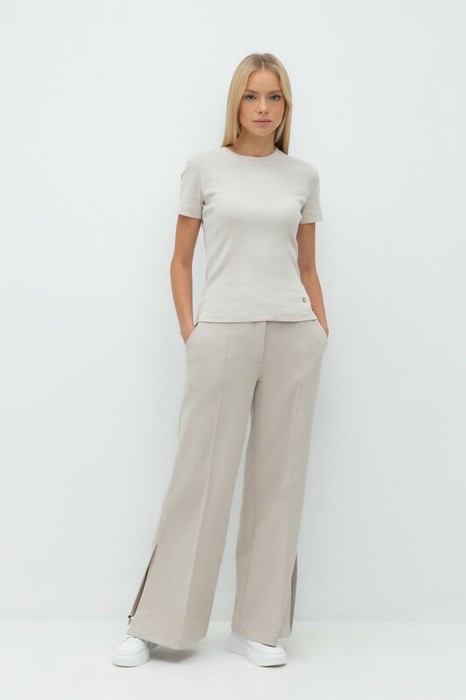 Свободные женские брюки с разрезами и боковыми карманами из плотного гладкого трикотажа интерлок. Низ обработан плоскими швами.