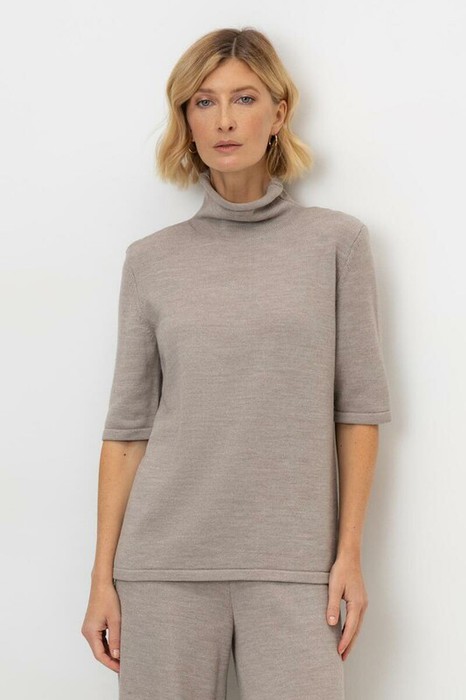 Джемпер в стиле прямой футболки, воротником-стойкой и короткими рукавами. Прямой силуэт, стандартная длина. Средняя плотность вязания, пластичная фактура. Выполнен гладью из мягкой полушерстяной пряжи. Шерсть в составе сохраняет тепло, а благодаря волокнам акрила изделие мягкое и дольше сохраняет форму.