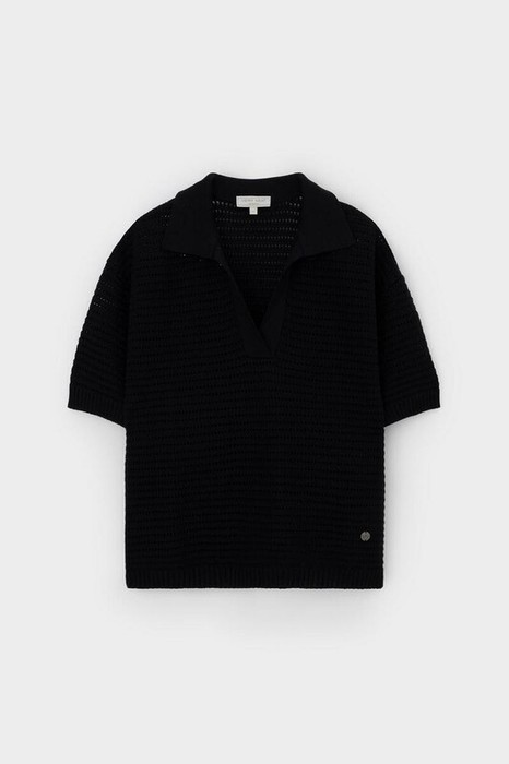 Воздушное поло ажурной вязки из итальянского хлопка. Мягкий воротник без застежки в стиле поло и спущенная линия плеча добавляет легкости при создании летних образов.