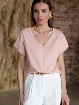 Джемпер поло с короткими рукавами из интерлока с V-образным вырезом и декоративной пуговицей.