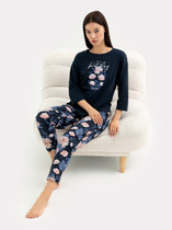 Легкий комплект для комфортного сна и отдыха набивного трикотажа с нежным рисунком из 100% натурального хлопка. Джемпер с V-образным вырезом, украшенный эластичным кружевом комфортно садится по фигуре. Брюки с поясом на резинке и атласной лентой. Гладкий материал приятен к телу и позволяет коже дышать.