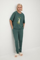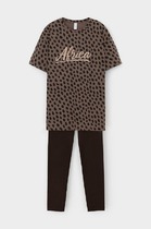 Легкий комплект для комфортного сна и отдыха из трикотажного полотна с эффектом меланжа. Футболка с принтом и спущенной линией плеча комфортно садится по фигуре.  Брюки с эластичными манжетами с боковыми карманами. Круглый шнур позволяет регулировать посадку. Гладкий материал приятен к телу и позволяет коже дышать.