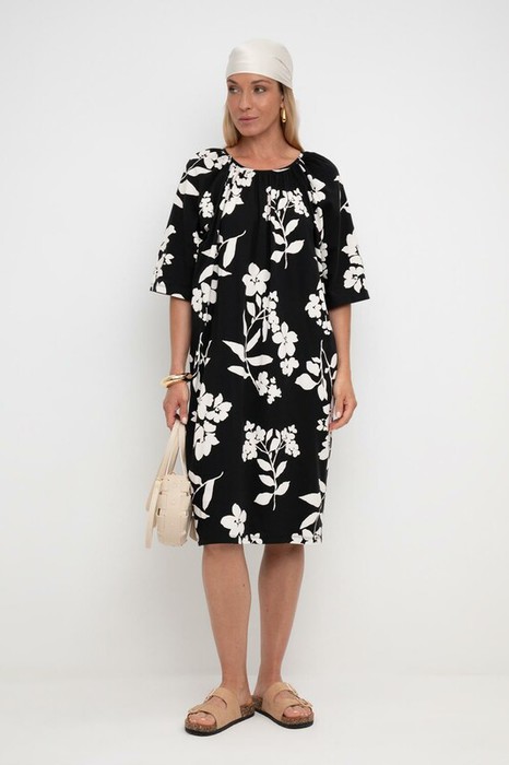 Легкое свободное платье с круглым вырезом на сборке, короткими рукавами из набивного трикотажа супрем.