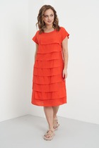 Легкое свободное платье с круглым вырезом на сборке, короткими рукавами из набивного трикотажа супрем.