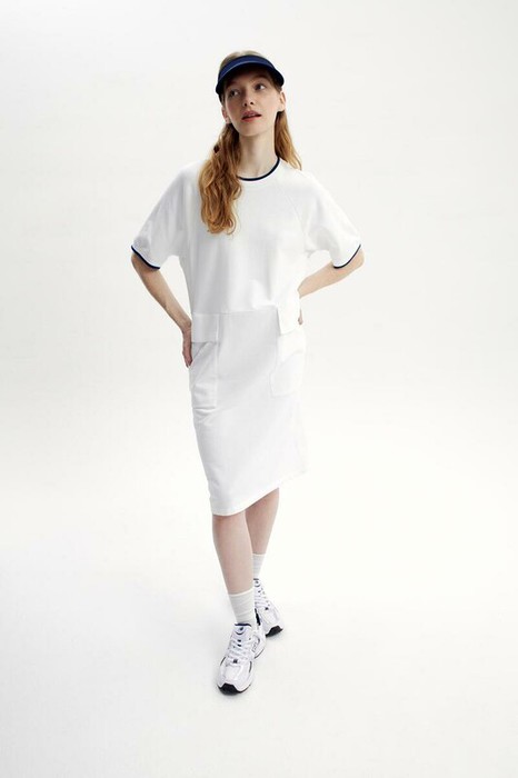 Летнее платье для создания спортивного образа из трикотажного полотна футер, изготовленного из гребенной пряжи. Декоративные манжеты и горловина выполнены из эластичного трикотажа.