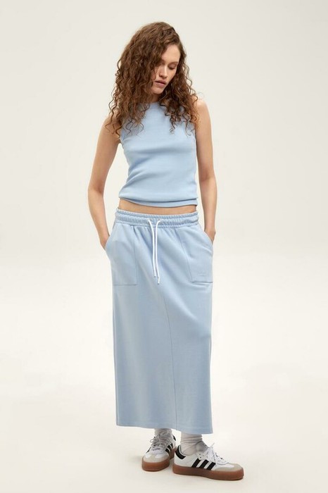 Юбка спортивного силуэта из мягкого двухцветного футера. Внутренняя сторона изделия представлена в натуральном цвете хлопка, внешняя в нежно-розовом. За счет использования крашенной пряжи, данный вид полотна прошел минимальную обработку, что придало изделию мягкость и шелковистость.