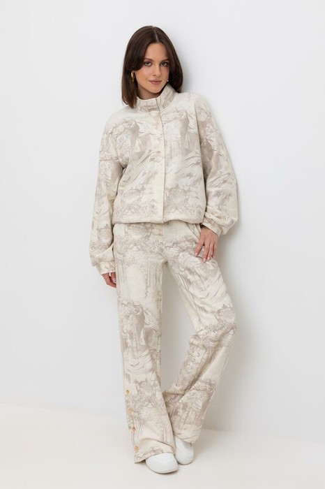 Укороченная трикотажная куртка на молнии с карманами и кулиской по низу. Произведена из мягкого набивного трикотажного футера. Спущенные рукава и манжеты  добавляют объем.