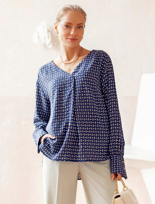 Блузка свободного кроя без застежки из лиоцелла с вискозой. Выполнена из премиальной вискозы с матовым блеском, как у натурального шелка. Крупный геометрический принт поддержан дизайнерскими манжетами. Изделие из легкого материала сохраняет безупречный вид в течение всего дня.