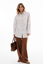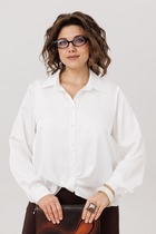 Свободный крой блузки и спущенная линия плеча дарят ощущение легкости и непринужденности, делая образ одновременно женственным и современным. Широкие рукава средней длины гармонично дополняют образ и идеально подходят для полных рук, обеспечивая комфорт, свободу движений и уверенность. Аккуратная застежка на маленькую пуговицу добавляет утонченности, а круглый вырез красиво обрамляет шею, создавая аккуратную линию декольте.