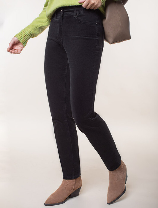 Брюки выполнены из мягкого хлопкового микро-вельвета с добавлением эластана. Изделие комфортно садится по фигуре и не сковывает движения. Модель с пятью карманами, как у джинсов-скинни дополнена высококачественной фурнитурой с фирменным логотипом бренда. Хорошо комбинируется с вязаным трикотажем, блузками и денимом. Как альтернатива брюкам, в нестрогий офисный дресс-код.