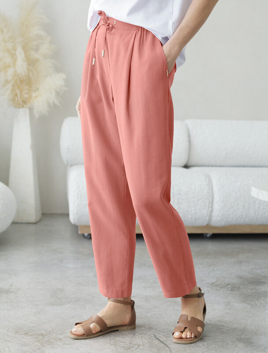 Брюки выполнены из плотного лиоцелла. Модель дополнена карманами и поясом с эластичной резинкой и регулируемым шнурком с золотистой фурнитурой. Ткань изделия отлично держит форму, плавно драпируется и не просвечивает. В теплое время года приятно охлаждает кожу. Добавление синтетических волокон в составе изделия, предотвращает сминаемостьи поддерживает формоустойчивость. Брюки сочетаются в костюме с топом D23.063 и блузкой D29.266, D29.267 и жилетом D27.002