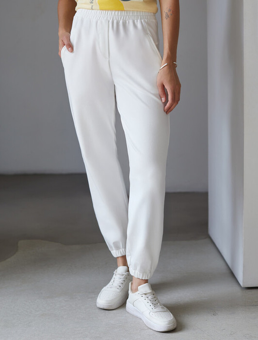 Брюки выполнены из эластичного футера двухнитки. Изделие дополнено боковыми карманами с фирменным логотипом бренда. Пояс на резинке регулируется потайным хлопковым шнурком. Эластан в составе гарантирует комфорт и формоустойчивость. Модель сочетается в костюме с свитшотом D49.072 и паркой D49.076