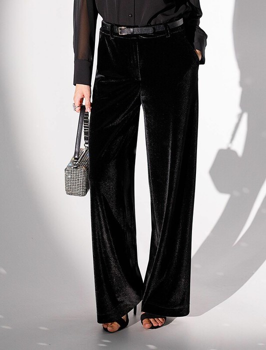 Брюки палаццо созданы для тех, кто ценит благородный стиль и комфорт. Мягкая бархатная ткань придает образу лаконичный блеск и особый шарм,. Благодаря эластичной ткани свободные брюки подойдут на любую  фигуру, подчеркивая достоинства силуэта и позволяя чувствовать себя уверенно в любой ситуации, Вы будете чувствовать себя уверенно. Лаконичный крой прямых брюк гармонично сочетается с повседневными вещами, превращая образ в шикарный вариант для вечерних мероприятий или торжественных событий.